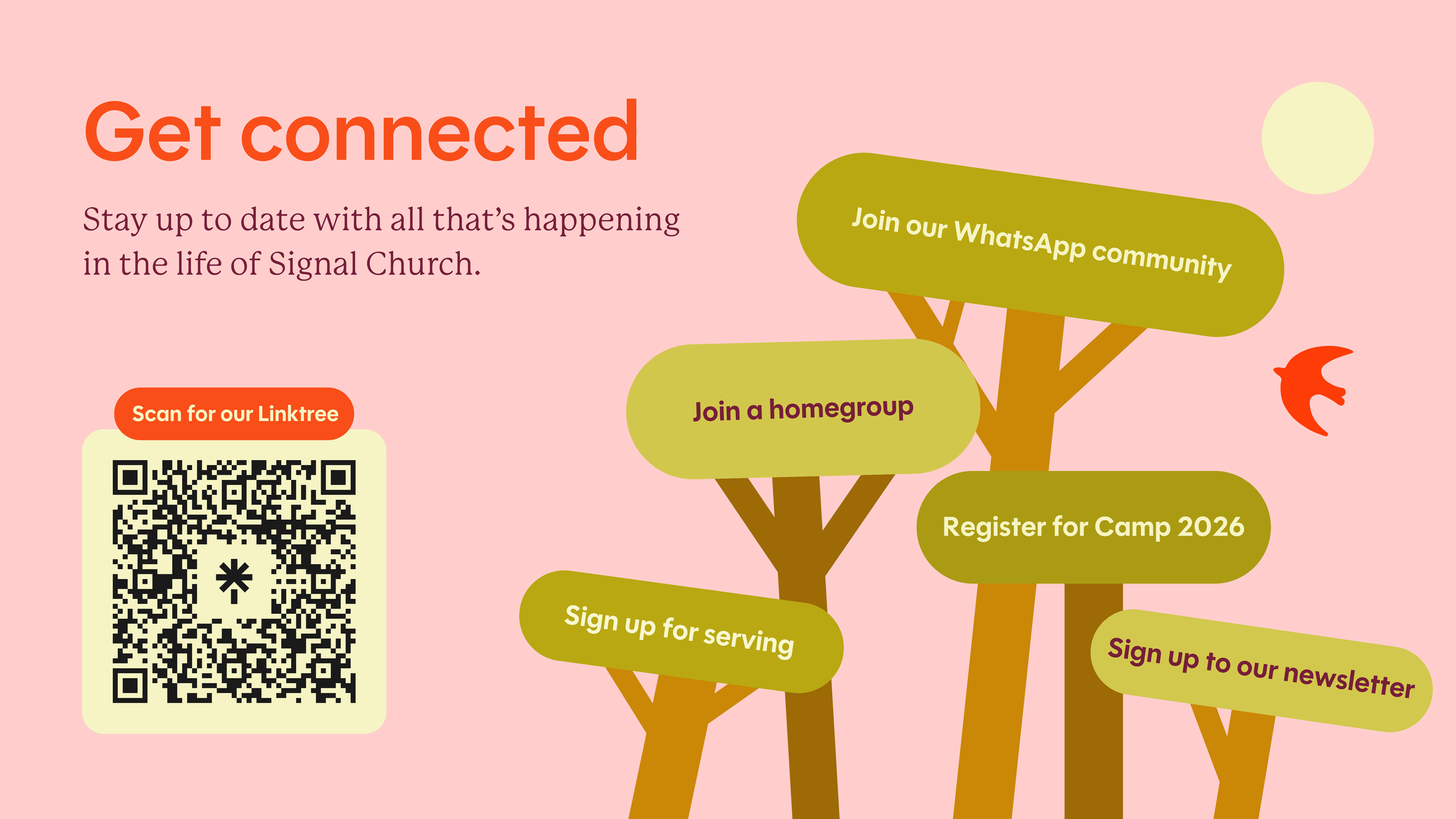 Welcome to Signal! We would love for you to join us at one of our Sunday Meetings. We meet at the Groote Kerk Sentrum 55 Kloof Street, Cape Town at 9.30am. Everyone is welcome!